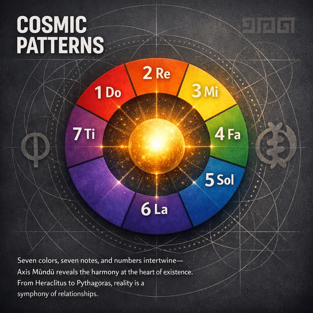 This mystery of perception mirrors the wisdom at the heart of the Axis Mũndũ Canonical Blueprint. Here, the seven colors of the rainbow, the seven notes of music’s solfège, and the numbers one through seven intertwine as one cosmic pattern.